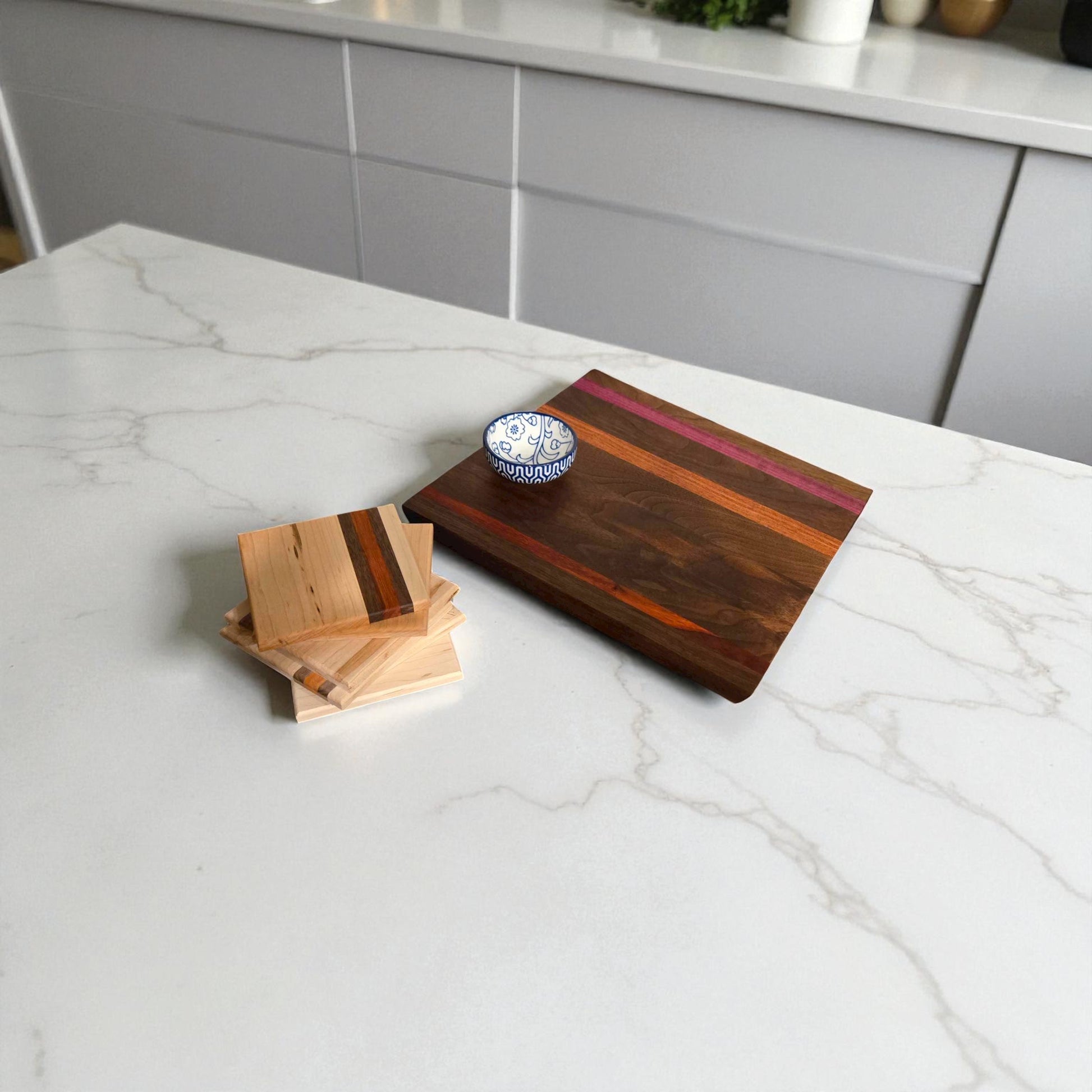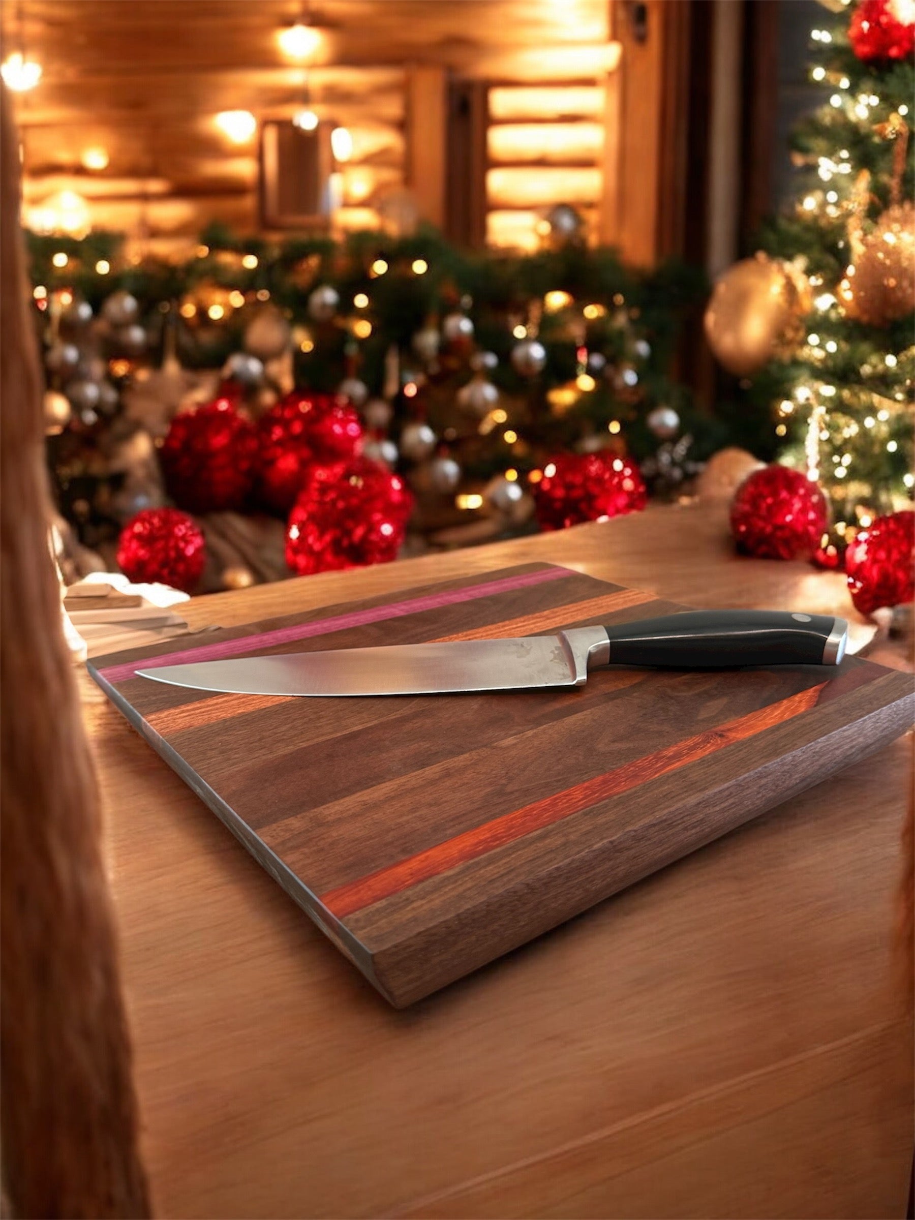 The chunk is just that, a big chunk of heavy duty cutting board made with beautiful walnut, purple heart, and African Paduak. This cutting board is ready for some serious use, whether its carving up the prime rib or cutting those fresh veggies. The chunk can do it all.